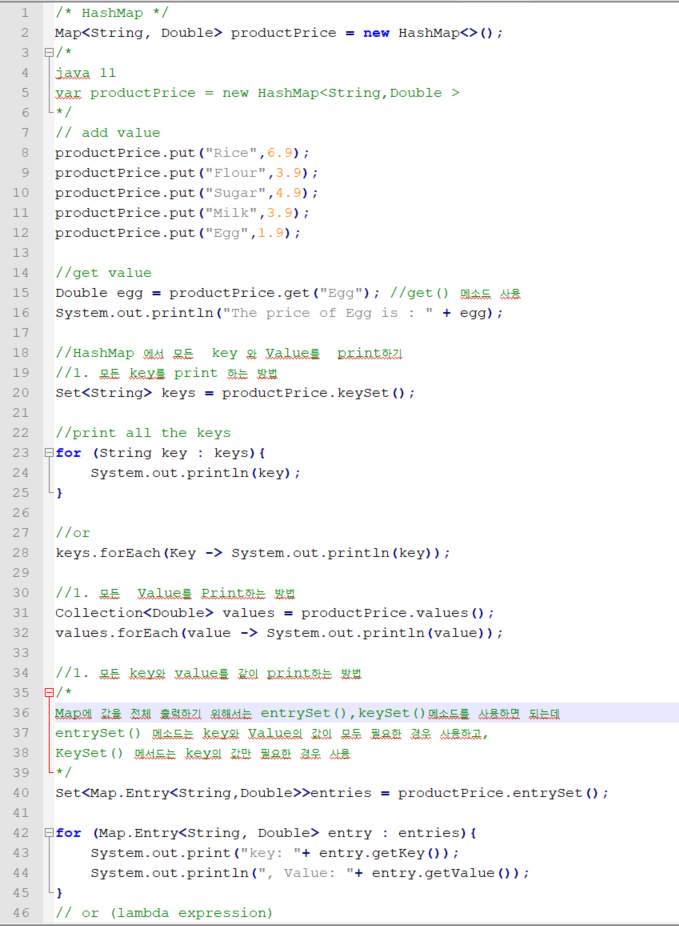 - HashMap에 저장된 Key-Value값을 엔트리(키와 값을 결합)의 형태로 Set에 저장하여 반환한다