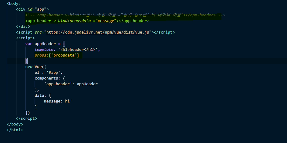 * 상위에서 하위로 데이터를 내려줌 , 프롭스 속성