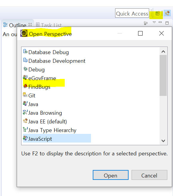 오른쪽상단에서 표(Open Perspective)처럼 되있는 것을 클릭하시고eGovFrame 을 클릭하세요.