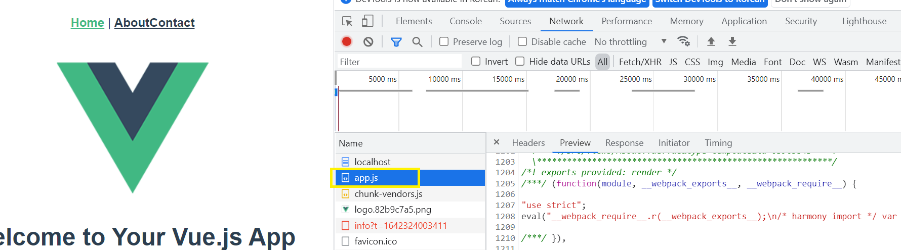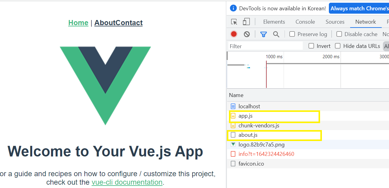 1번째 방식을 사용하게 되면 개발자도구 Network화면상에서 app.js 안에서 모든 componet들이 실행되도록 할수 있음(모든 클라이언트가 내려져 있어야함)