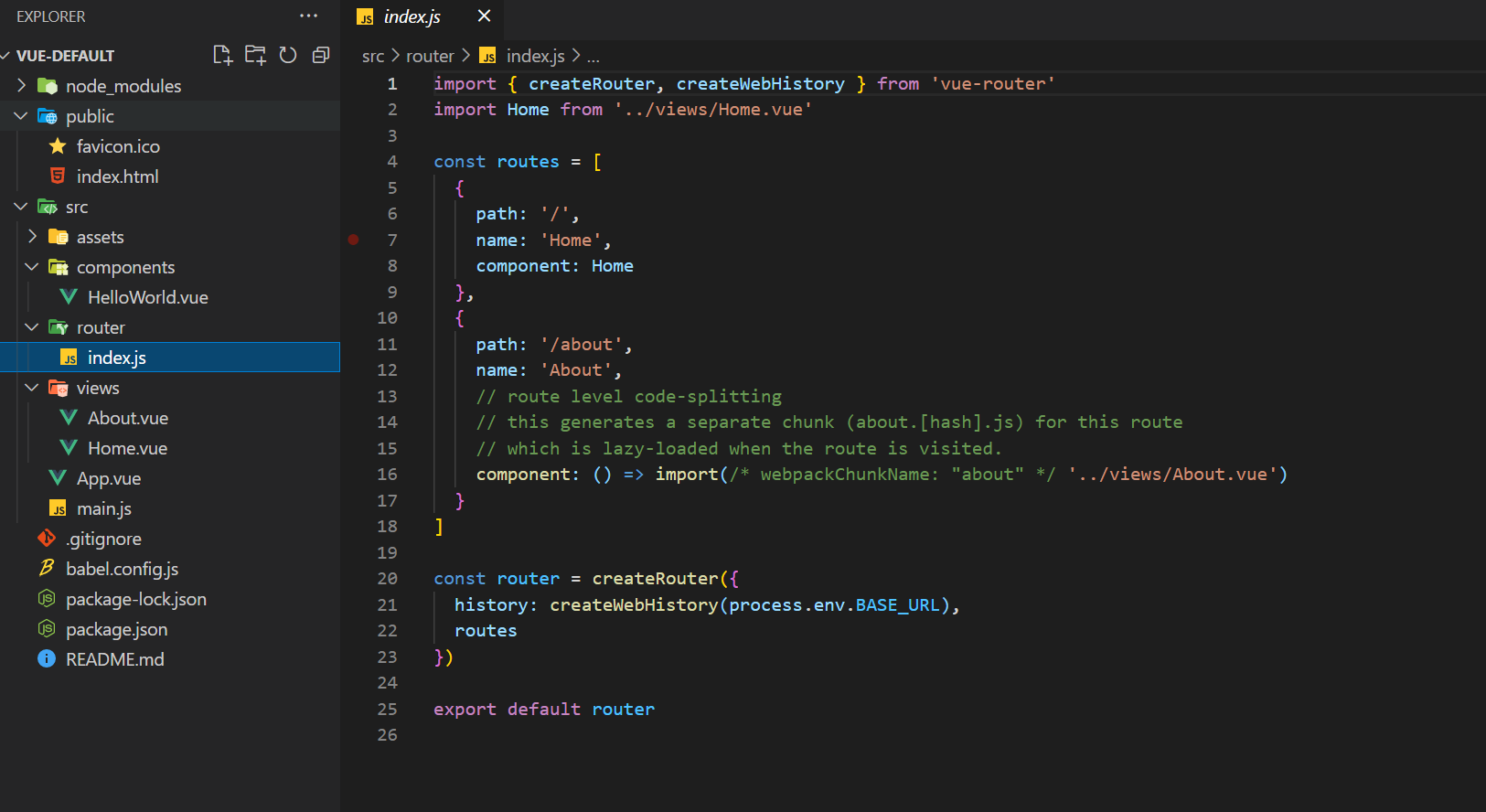 router의 index.js 파일을 보면 rountes 안에 path,name,coponent 가 생김