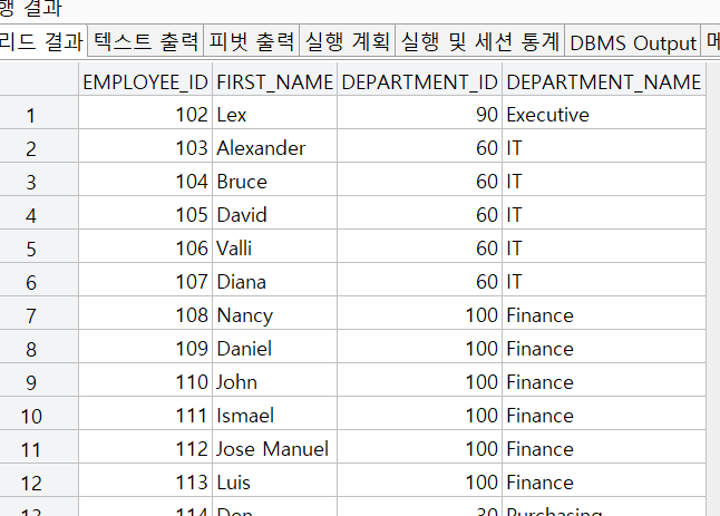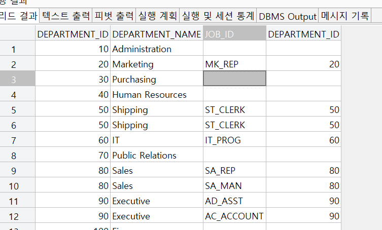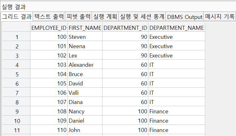 //공통적으로 존재하는 부서번호(DEPARTMENT_ID)를 등호 연산자를 사용해 조회조건에 명시