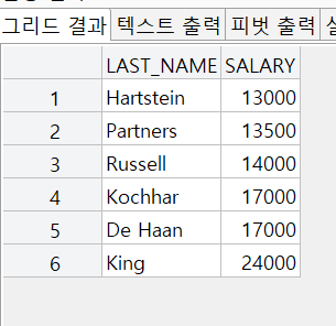 6. 20 번 및 50 번 부서에 근무하며, 연봉이 5000 ~ 12,000 사이인 사원들의 LAST_NAME 및 연봉을 조회한다.