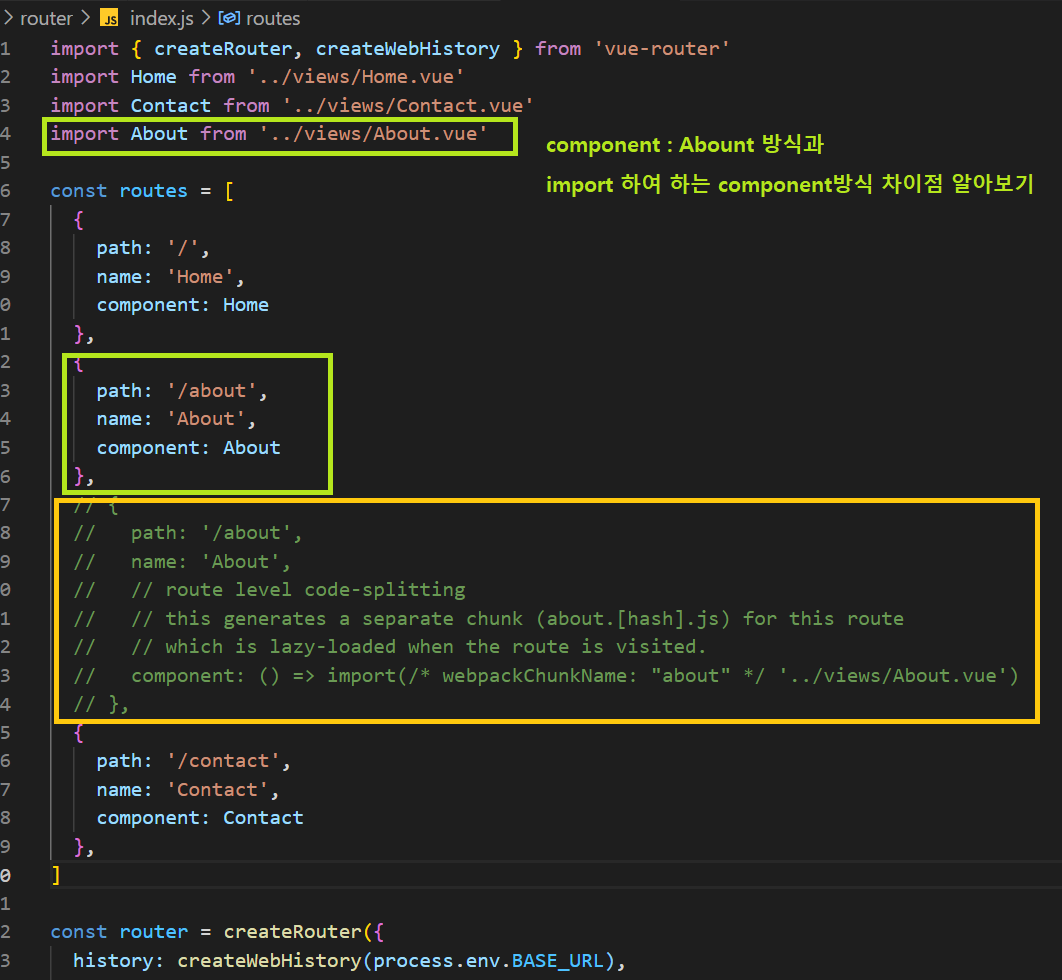 router의 index.js 파일을 보면 rountes 안에 path,name,coponent 가 생김